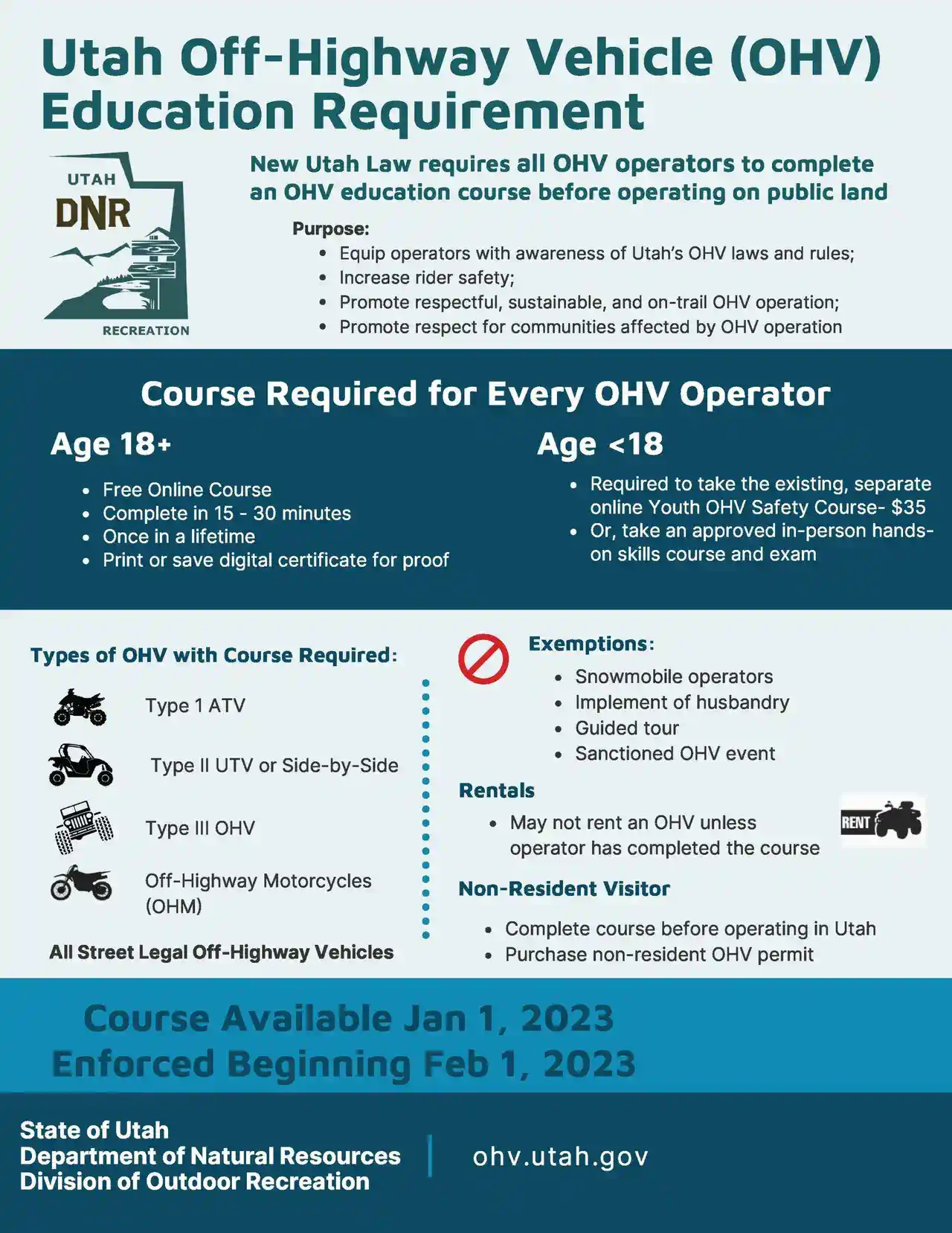 Beginning January 1, 2023, Utah will require all off-highway vehicle operators to complete the Utah Off-Highway Vehicle Education Course